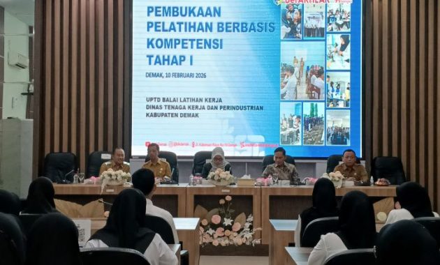 Demak — 10/2 Bupati Demak memberikan sambutan pada pembukaan Pelatihan Berbasis Kompetensi yang diselenggarakan di Grhadika Bina Praja, Kabupaten Demak. Dalam arahannya, Bupati menekankan pentingnya pelatihan sebagai bekal nyata bagi peserta untuk meningkatkan kemandirian ekonomi.